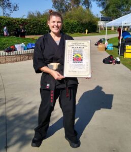 Because of the trauma I had gone through and my passion to continue training, I was inducted into the U.S. Martial Arts Hall of Fame as 2017’s Woman of the Year. Happy to say I am the first ostomate to ever be inducted. It’s a little weird to say, but I actually inspired myself, knowing everything I had gone through, and that I pushed myself to be my best. So, I continued to push my training to where I was able to train 3-4 hours 5 times a week. In 2018, I was invited to perform for the Abbot and test for my black belt at the Shaolin Temple in Dengfeng, China, which was a tremendous honor.